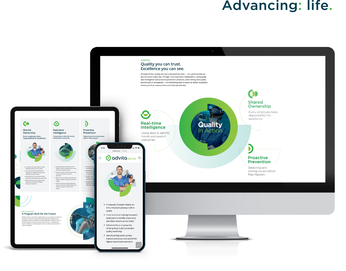 When a new ownership group acquired this orthopedic device company, they knew the brand needed to evolve to reflect their commitment to innovation and their vision for the future. Through an in-depth brand discovery process, we uncovered the challenges facing the company and identified opportunities to better position them in a competitive market. The result was a complete brand overhaul, starting with a new name that embodies their mission of advancing life for people with joint pain. We developed a modern tagline to guide their messaging, crafted a distinctive brand voice and designed a logo inspired by the glenosphere that speaks to both their product expertise and their comprehensive approach to care. The refreshed brand was then brought to life across video content, tradeshow environments and digital touchpoints — giving Advita Ortho a modern, cohesive identity that reflects their evolution and positions them to lead in the next era of orthopedic care.